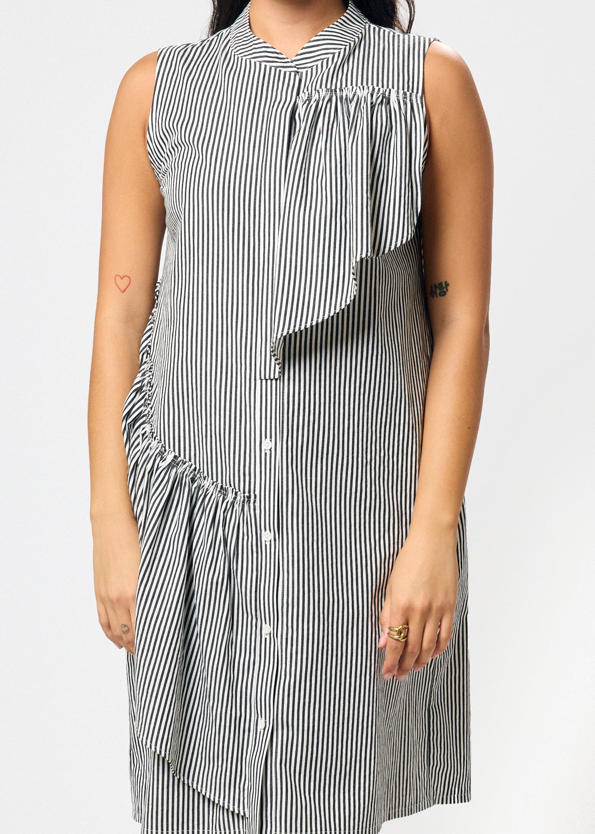 Starting over the heart, a ruffle spirals around the dress, landing near the front center hem. The body is a sleeveless shirt dress, with a stand collar and buttons down the center front. Darts at bust. Bias-tape-bound armholes. Made in a soft cotton twill shirting fabric with black and white vertical stripes. Silhouette is a slight hourglass.